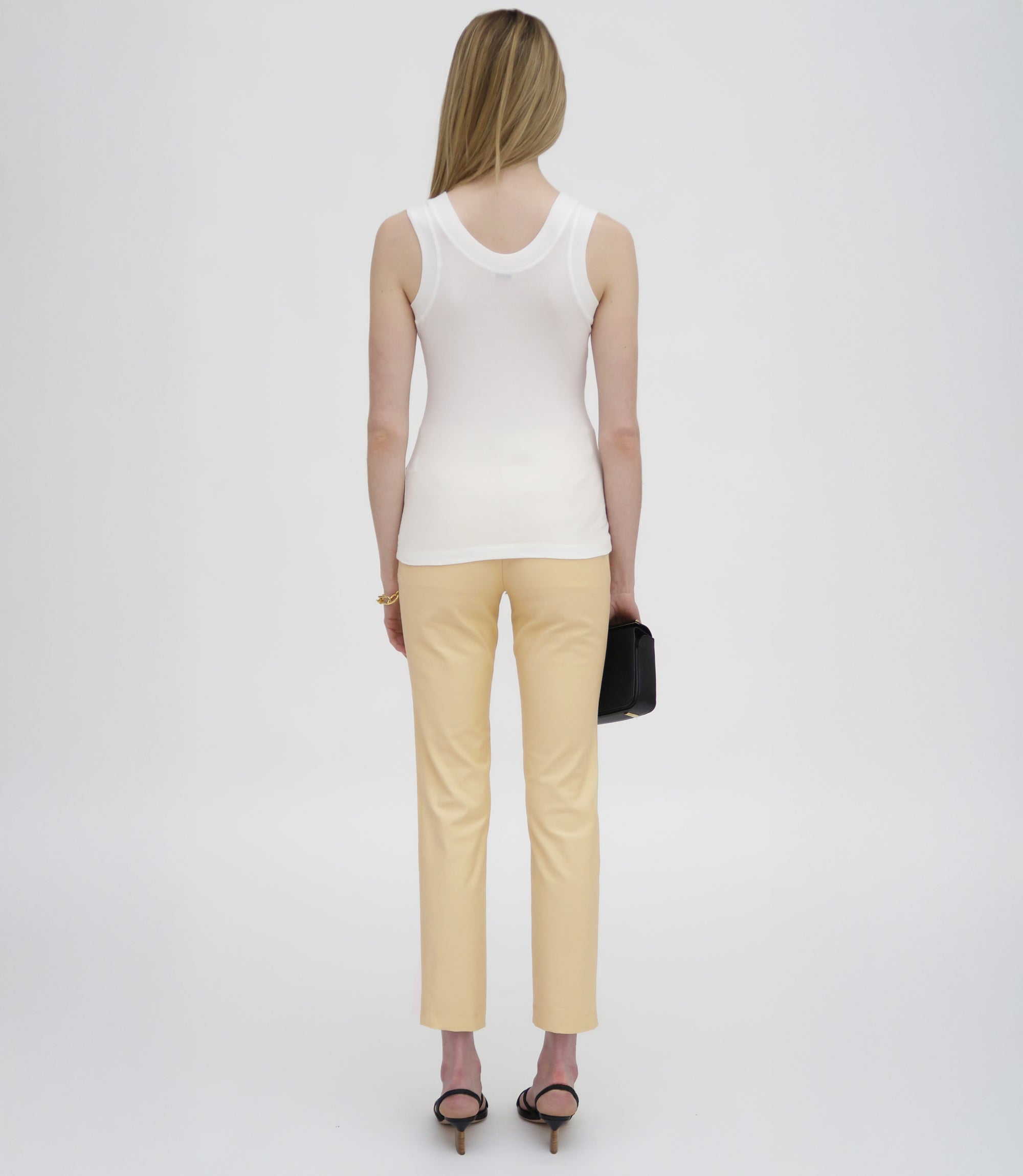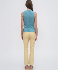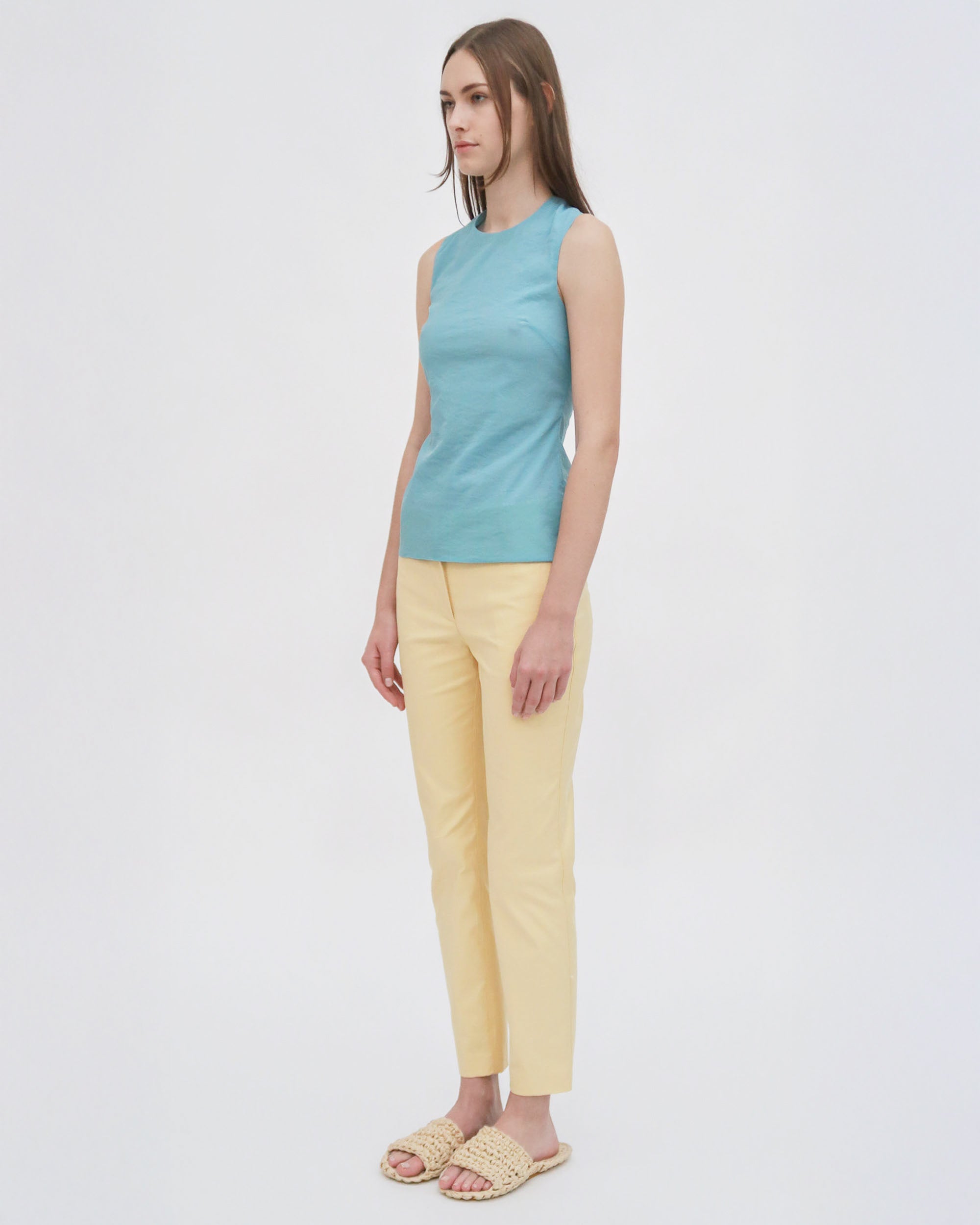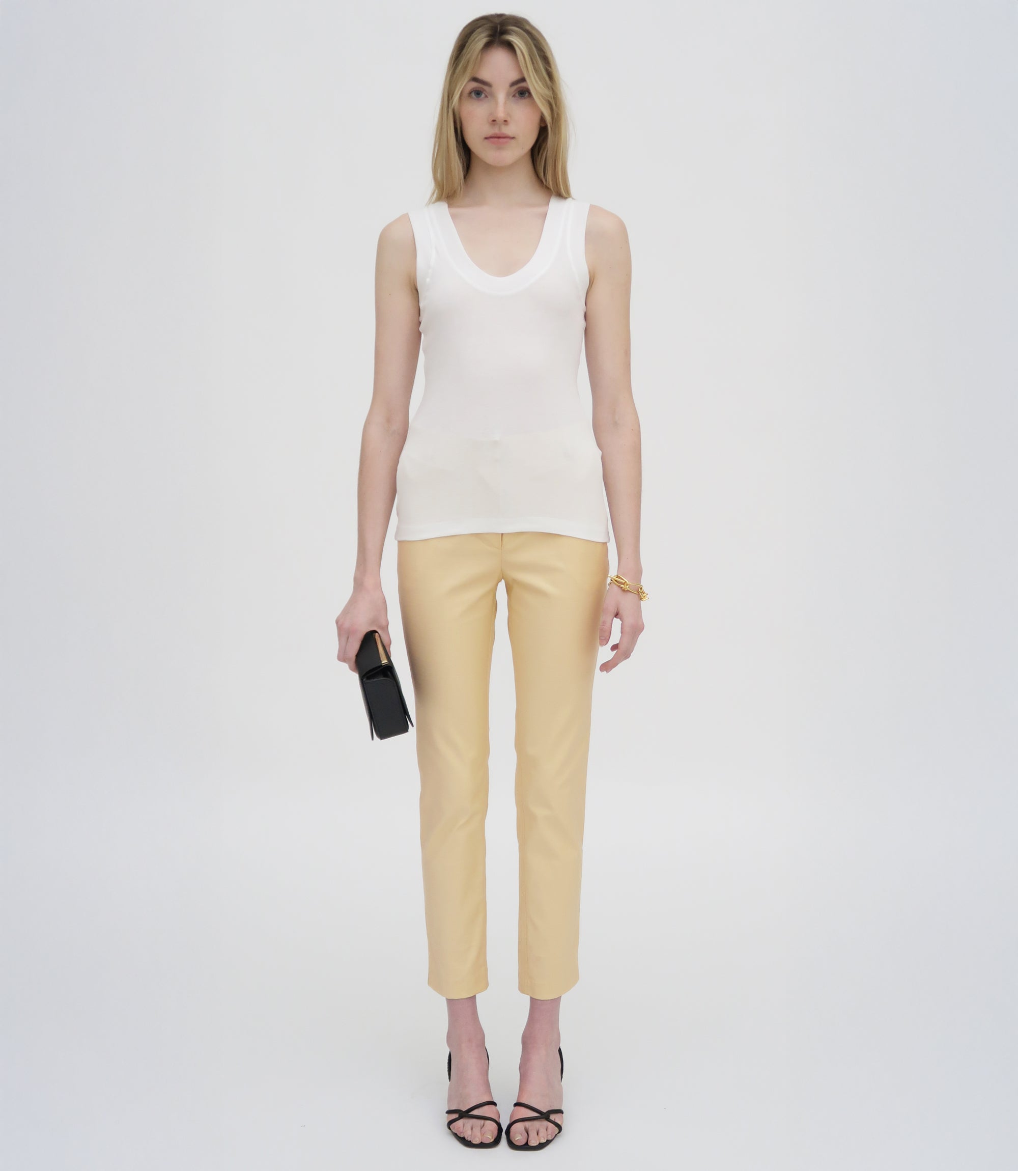 The Stretch Cotton Shantung is a crisp and structured cotton blend that offers newfound ease and comfort to tailored styles. It offers wearability to Rosetta Getty’s signature pant silhouettes.