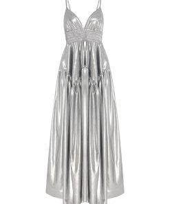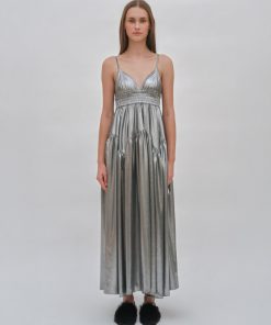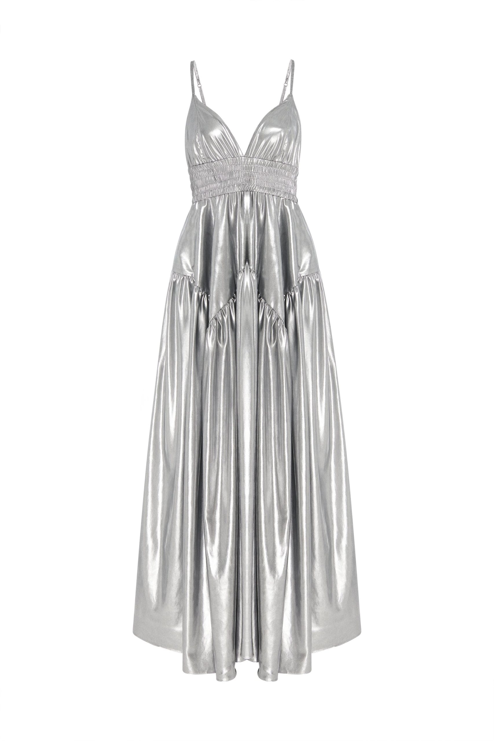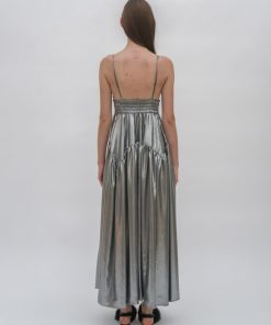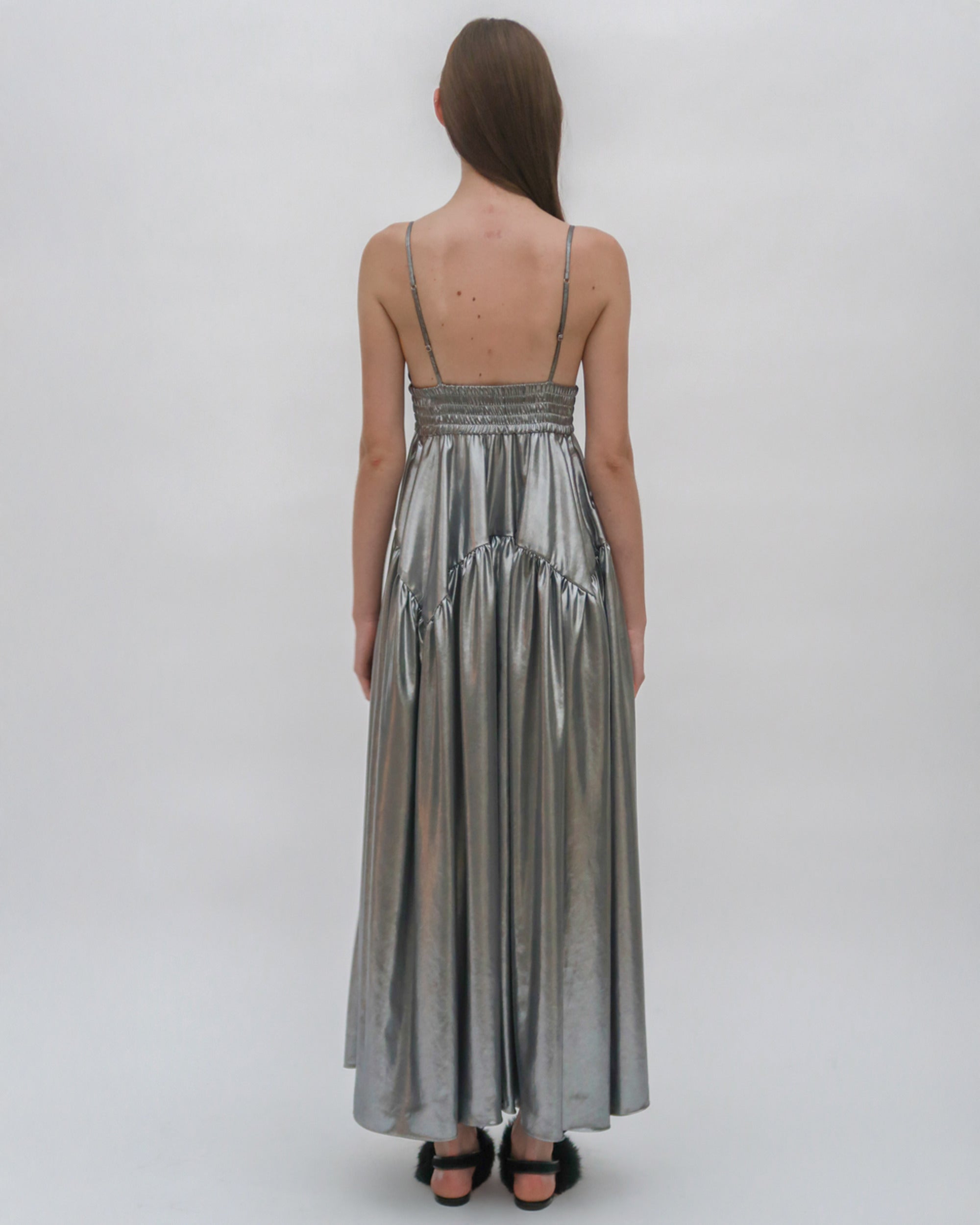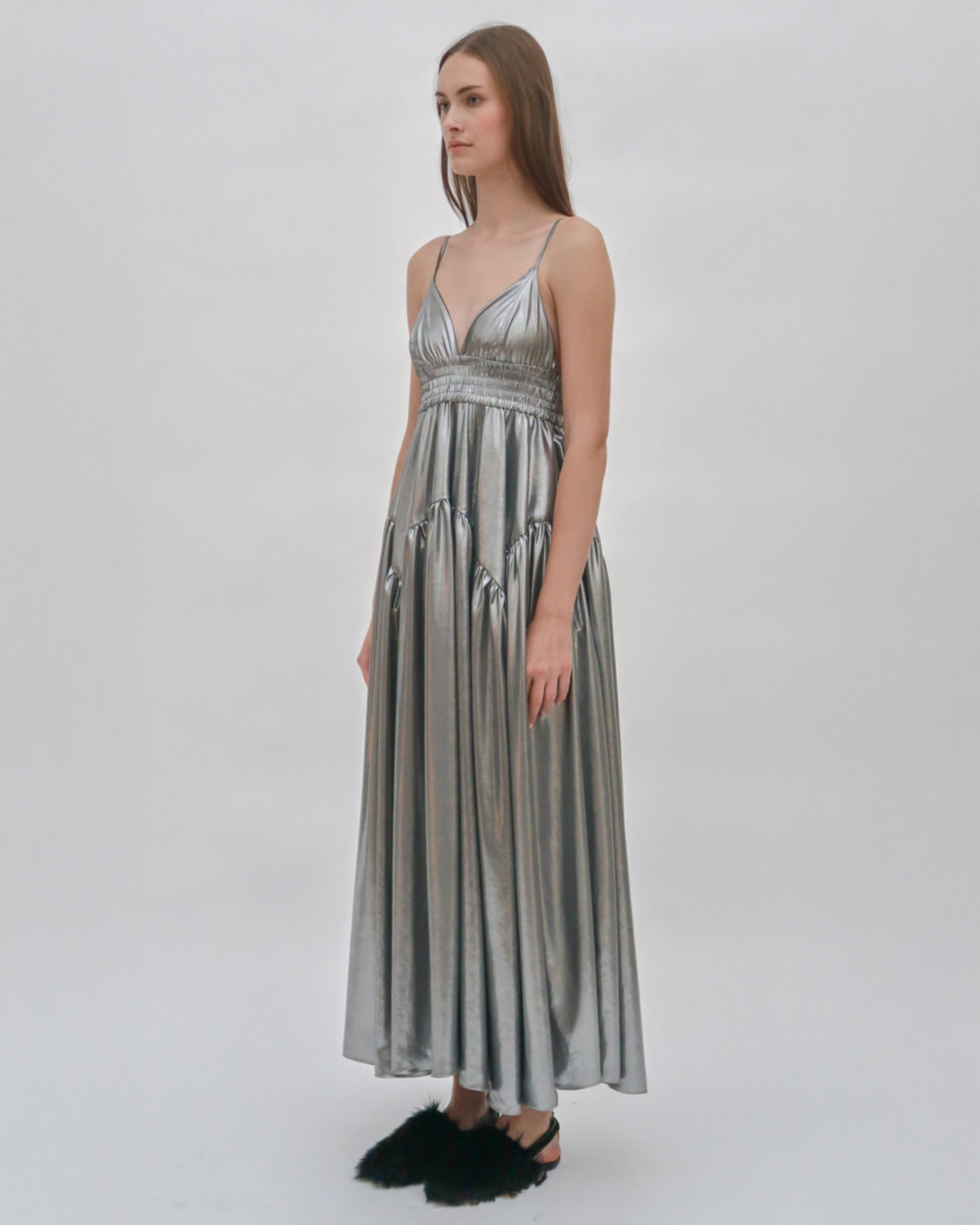 This stunning camisole dress is defined by a simple, wearable silhouette, elevated with shimmering fabric and thoughtful details. Shaped with a triangle bust atop an elasticized band, the sweeping skirt features gathering with godet seams for a full silhouette that hits at the ankle.