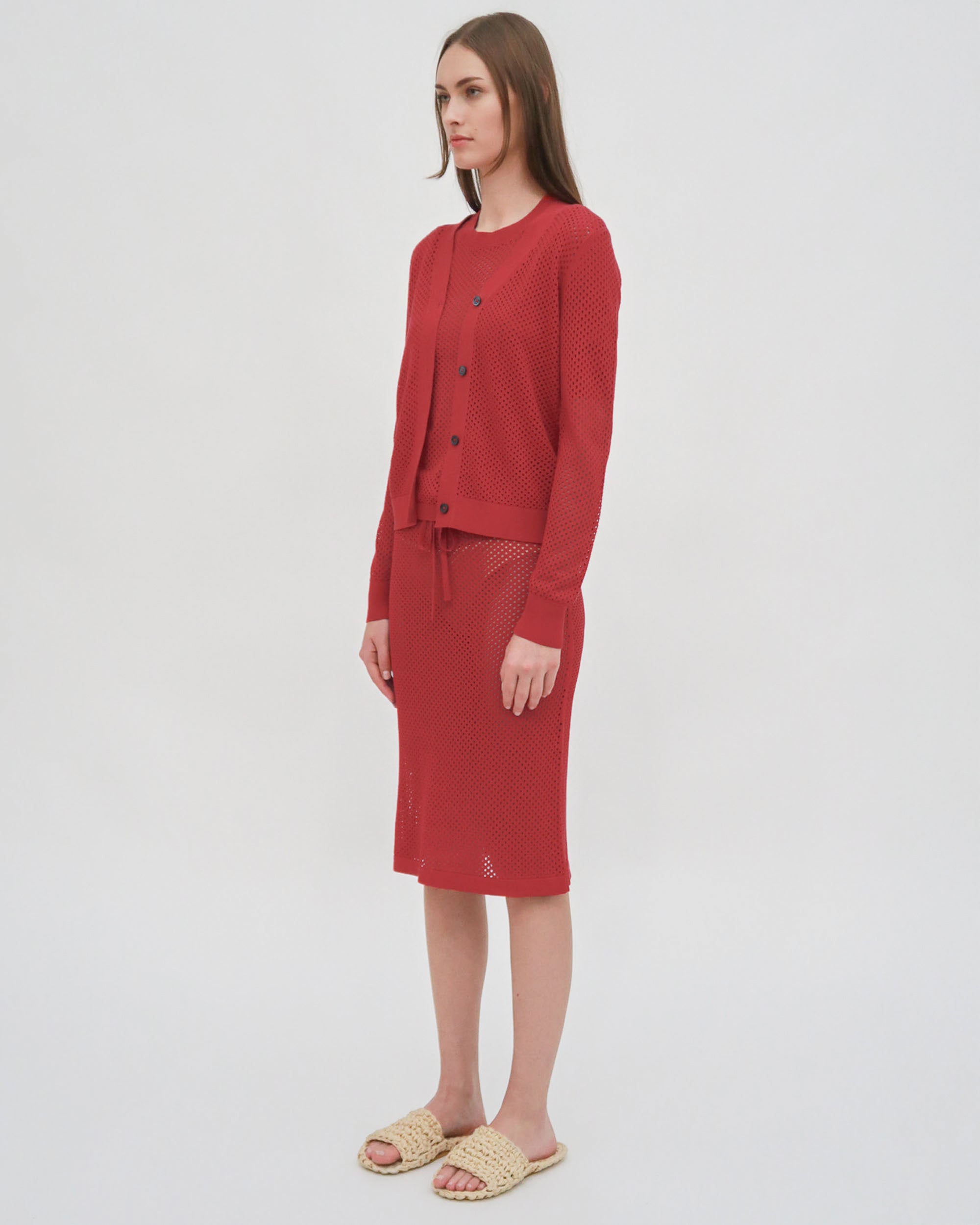 Knit to an open mesh finish, Rosetta Getty’s Spring 25 pointelle cardigan has a delicate feel. Transparent when worn on its own, the cardigan is ideal for layering—lending opacity and tangible dimension to the breathable style.