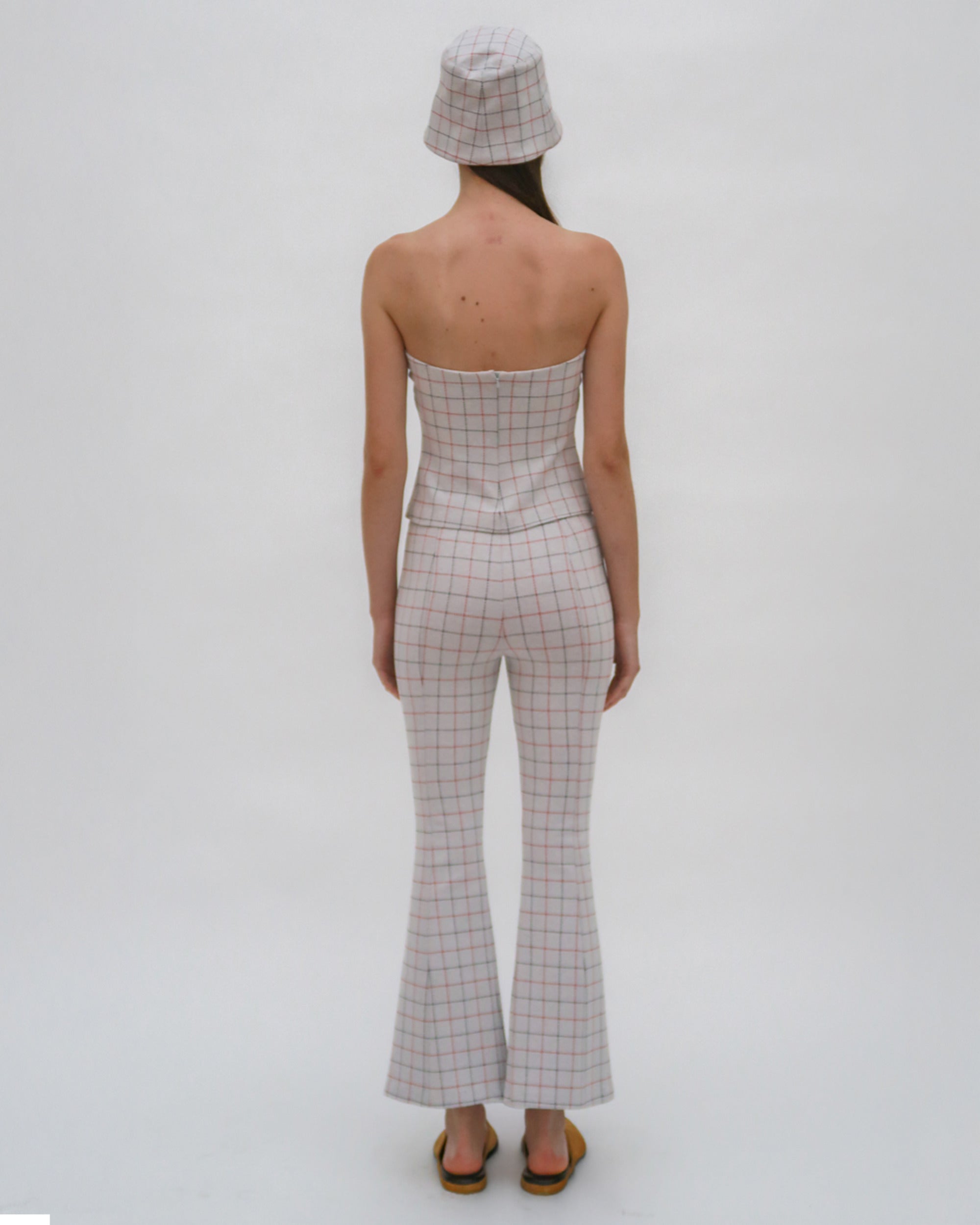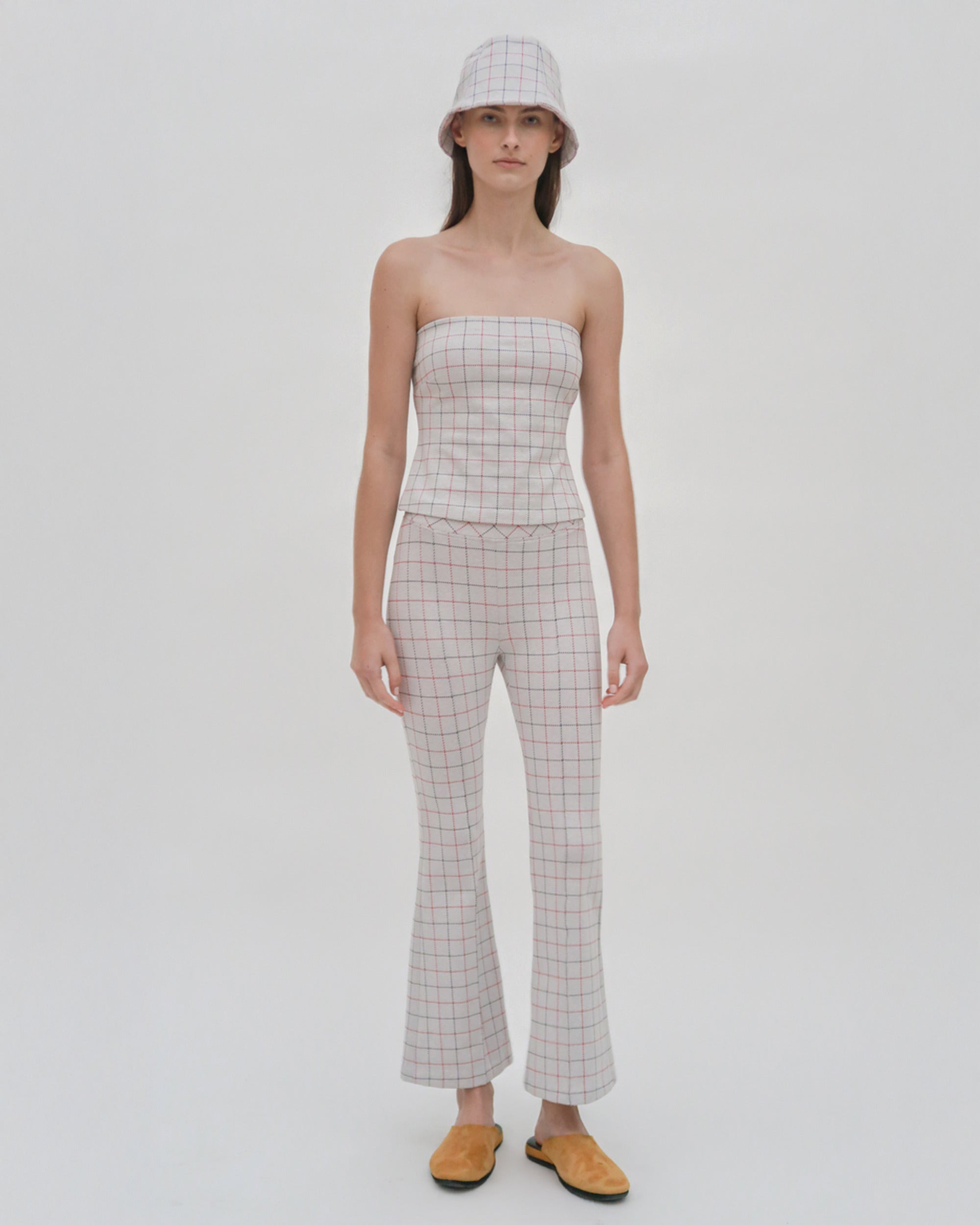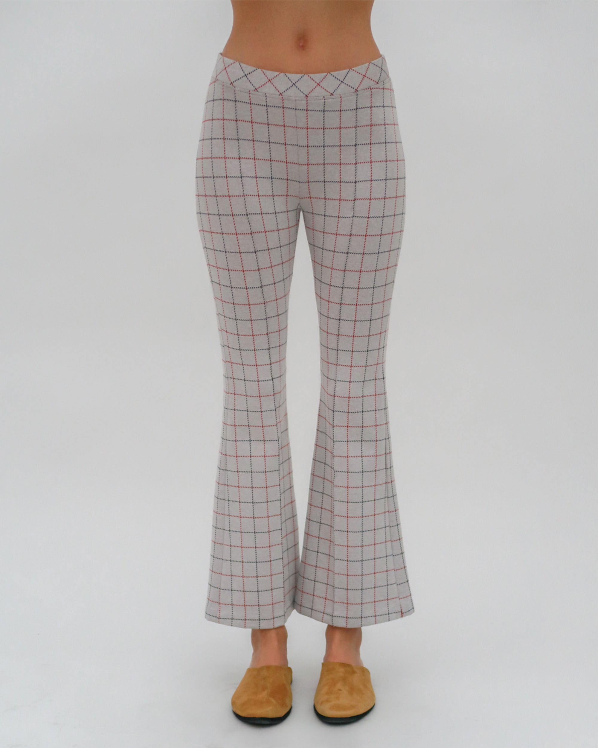 Crafted in the seasonal Striped Windowpane Interlock Jacquard, this signature pant is designed to flatter the body with a mid-rise and flared leg. Rosetta Getty’s special fabric and the elasticized waist impart ease to the cropped silhouette.