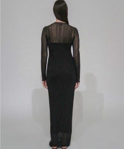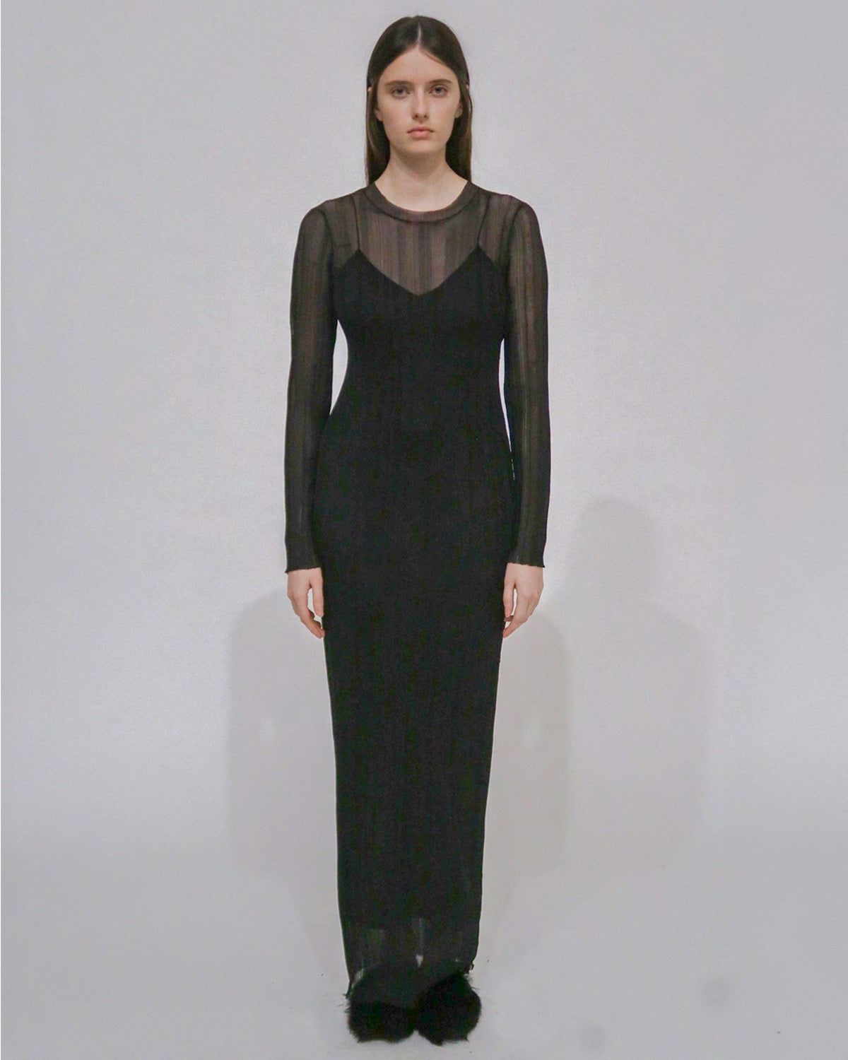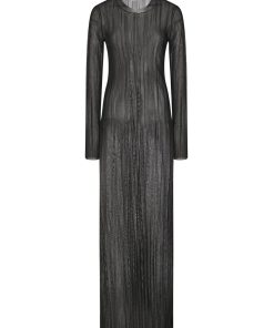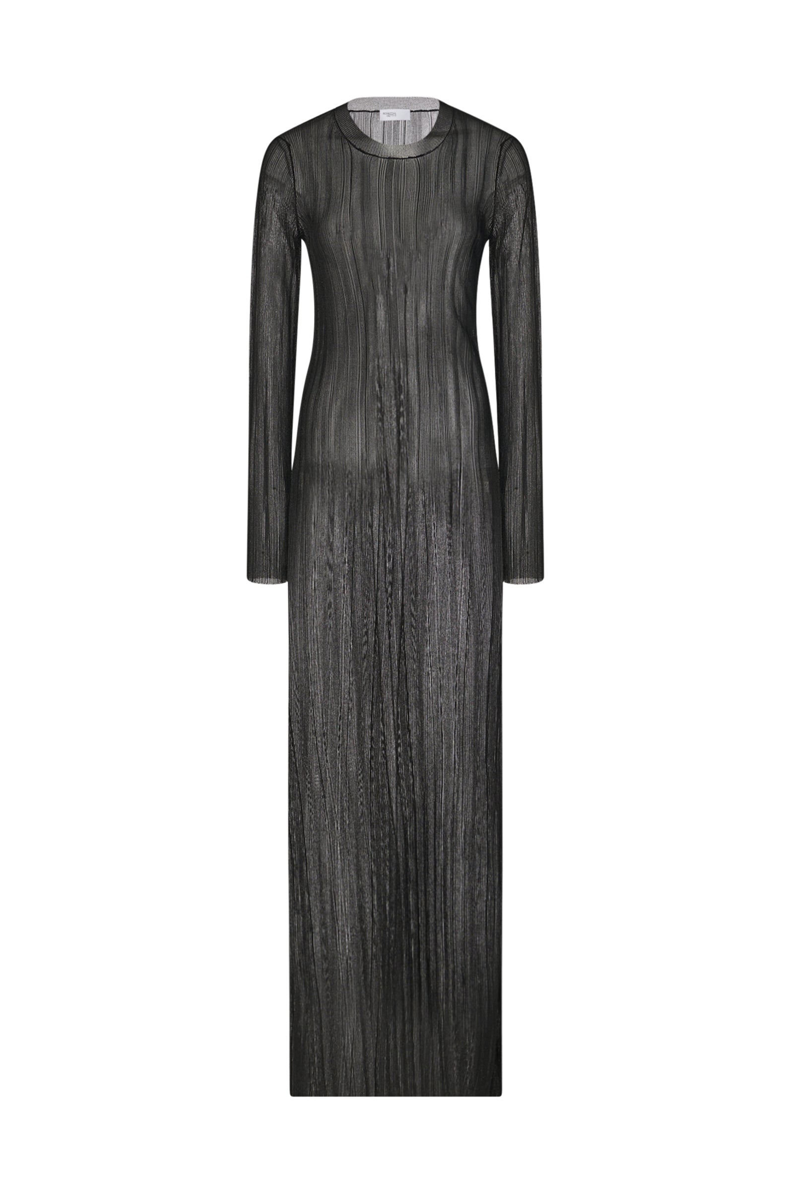 The new Sheer Plissé Long-Sleeve Dress is cut in the season’s exceptional Nylon Mesh, a knitted fabric. Completely transparent with a lightweight feel, it has a crewneck silhouette and a close maxi silhouette that is perfect for layering over and under other pieces in the collection.