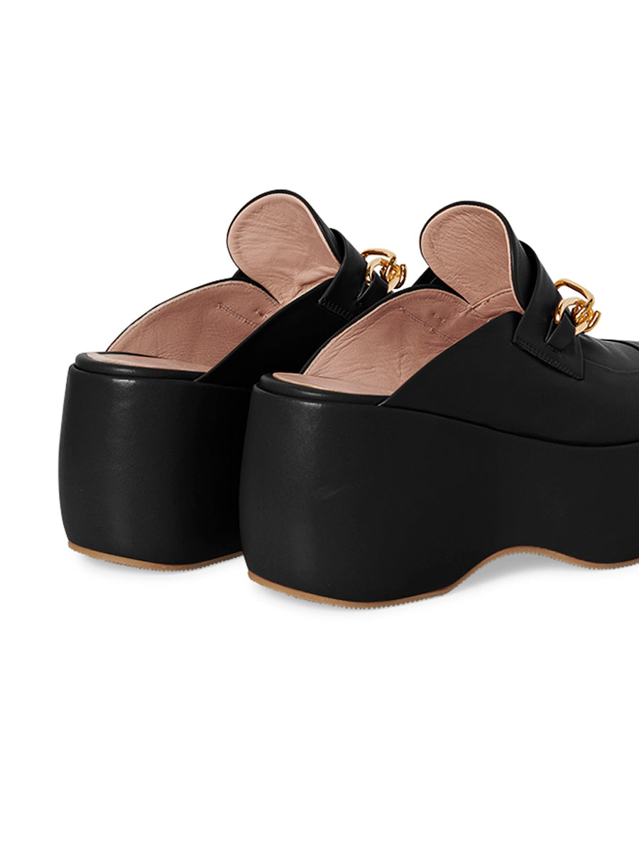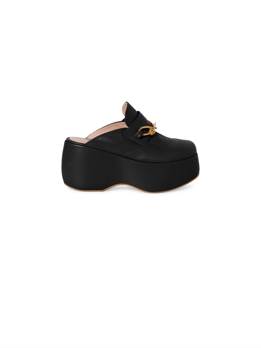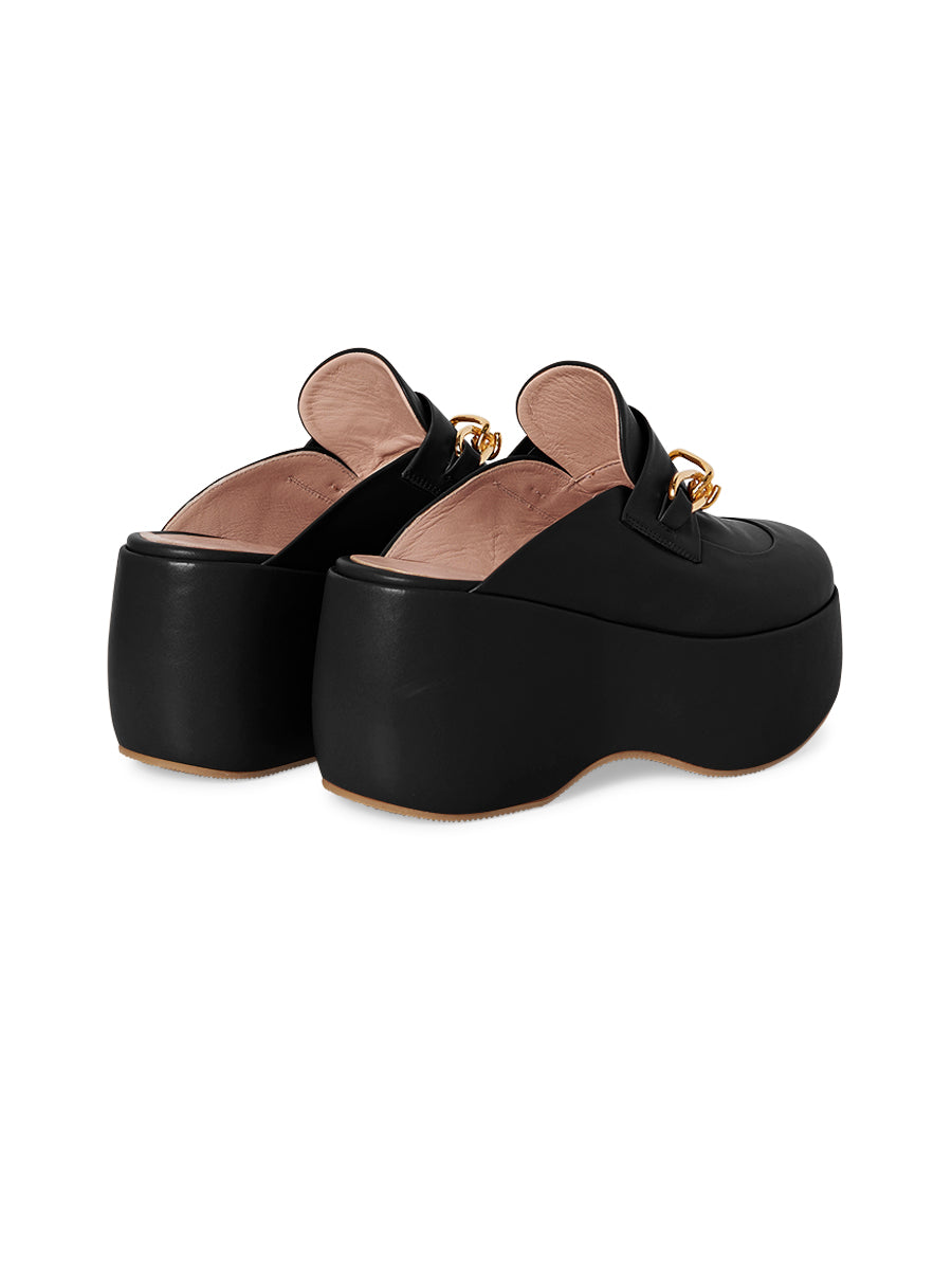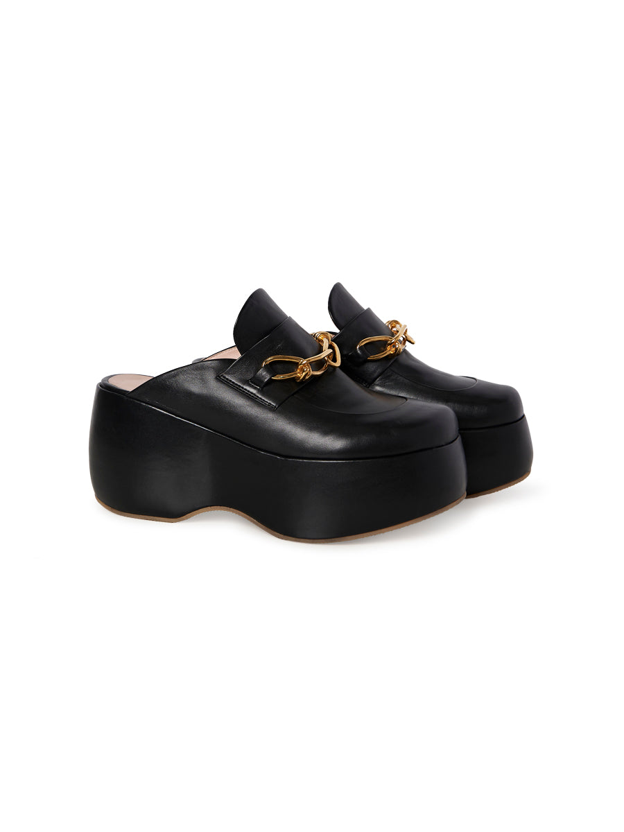 Embellished with a decorative chain detail across the vamp, Rosetta Getty’s Platform Clogs feature modern construction inspired by vintage silhouettes. The sleek calfskin upper melds seamlessly with the tonal leather-covered platform, allowing for a streamlined look that adds height with ease.