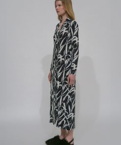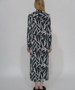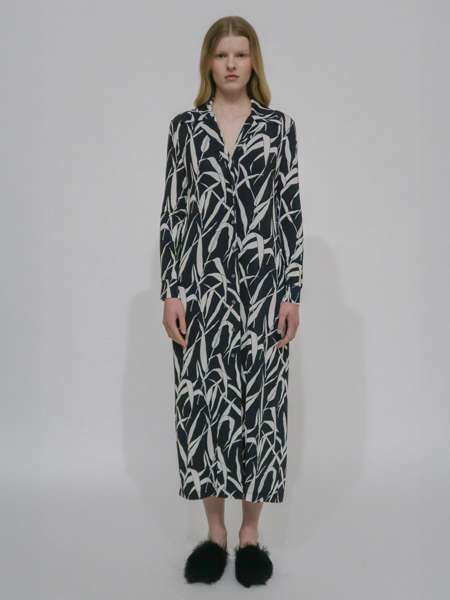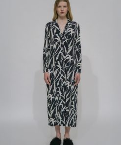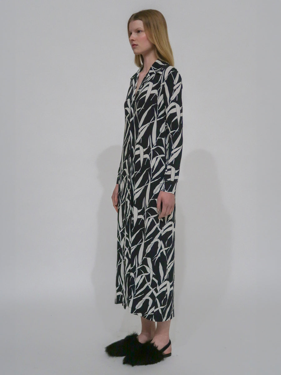 Spotlighting Pre-Fall 24’s Linework Leaves motif, a graphic pattern inspired by a vintage 1930’s print and created exclusively for Rosetta Getty, the Slim Jersey Shirtdress has a striking look. Crafted of fluid viscose jersey—an optimal fabric for travel and versatile wear—it can be easily dressed up or down, gently hugging the body with a slight A-line hem.