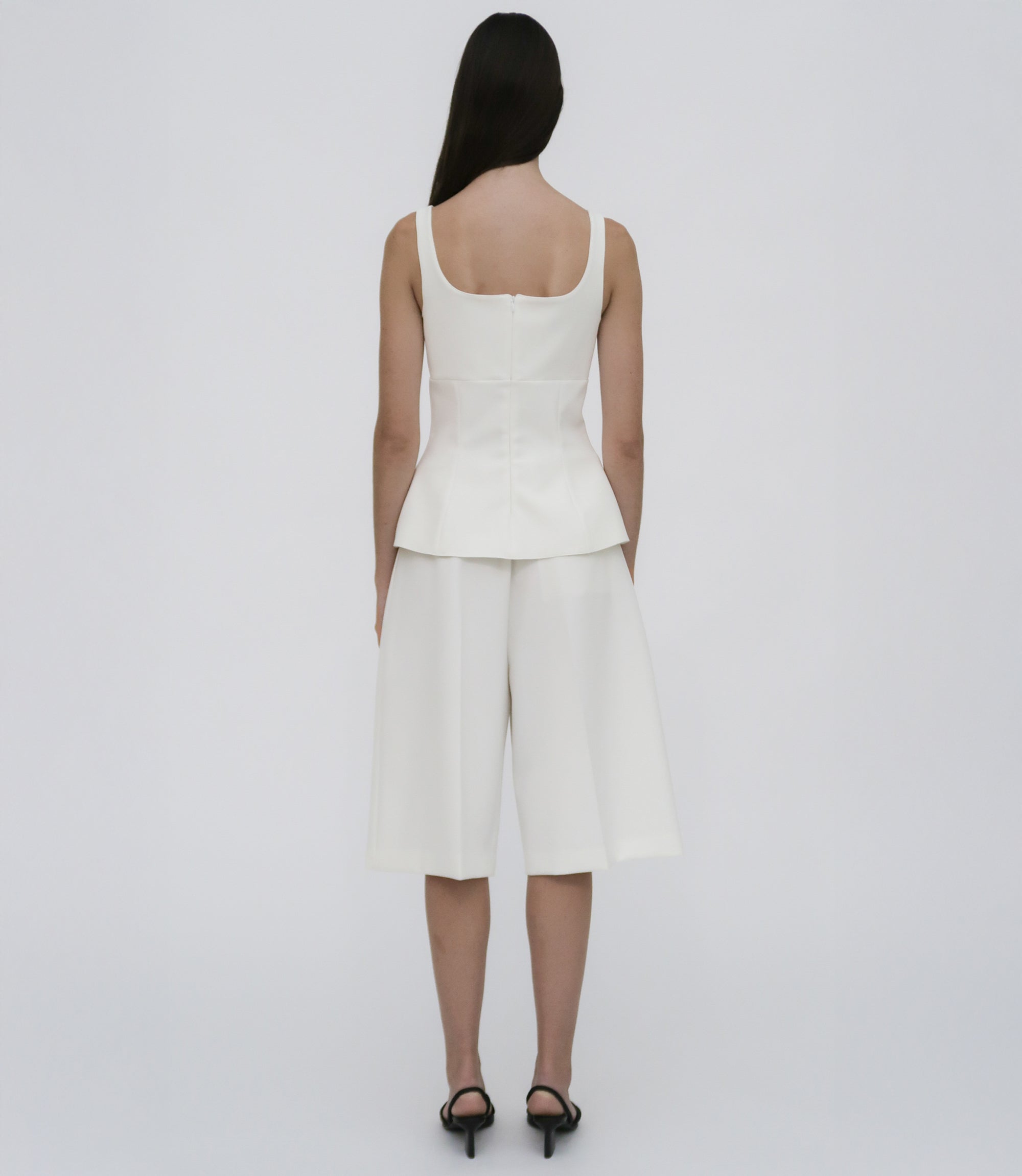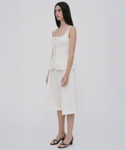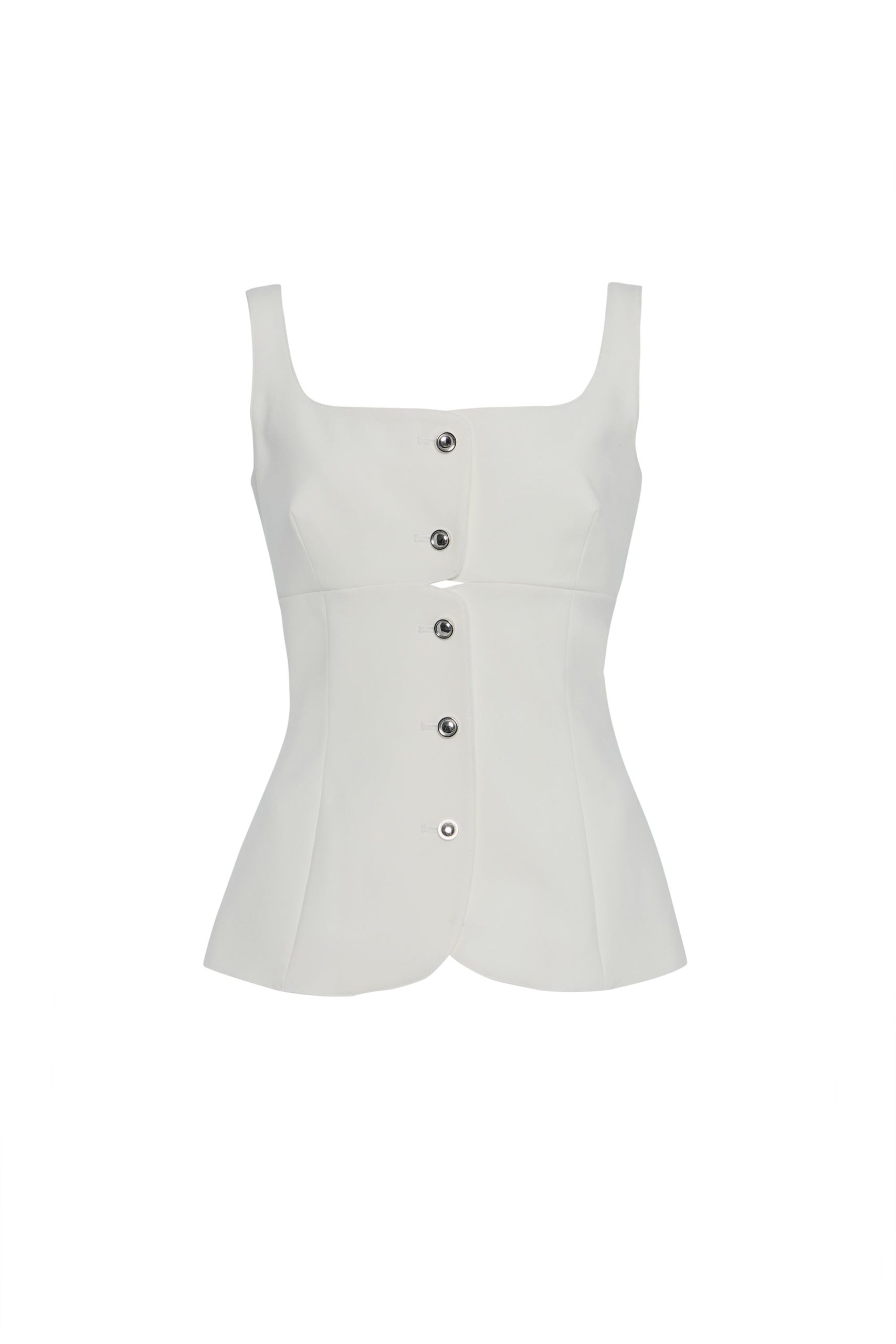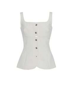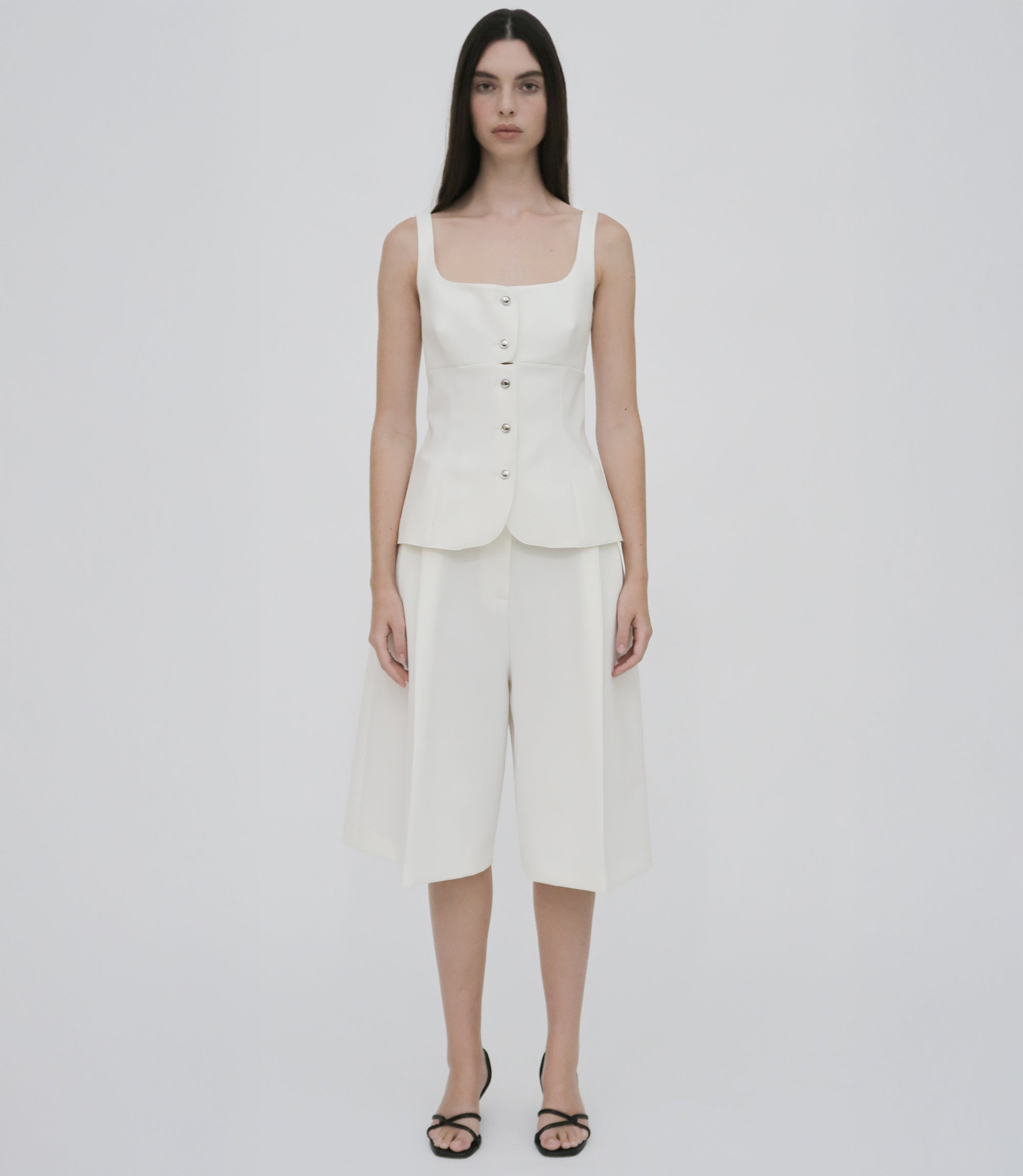 Offering convertible wear as a top or layered as a vest, the new Square Neck Button-Front Top is a welcome addition to our Cady Suiting capsule. The feminine style has a flattering wide neckline with darting for shape and is finished with Pre-Fall 25’s new metal buttons down the front.