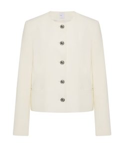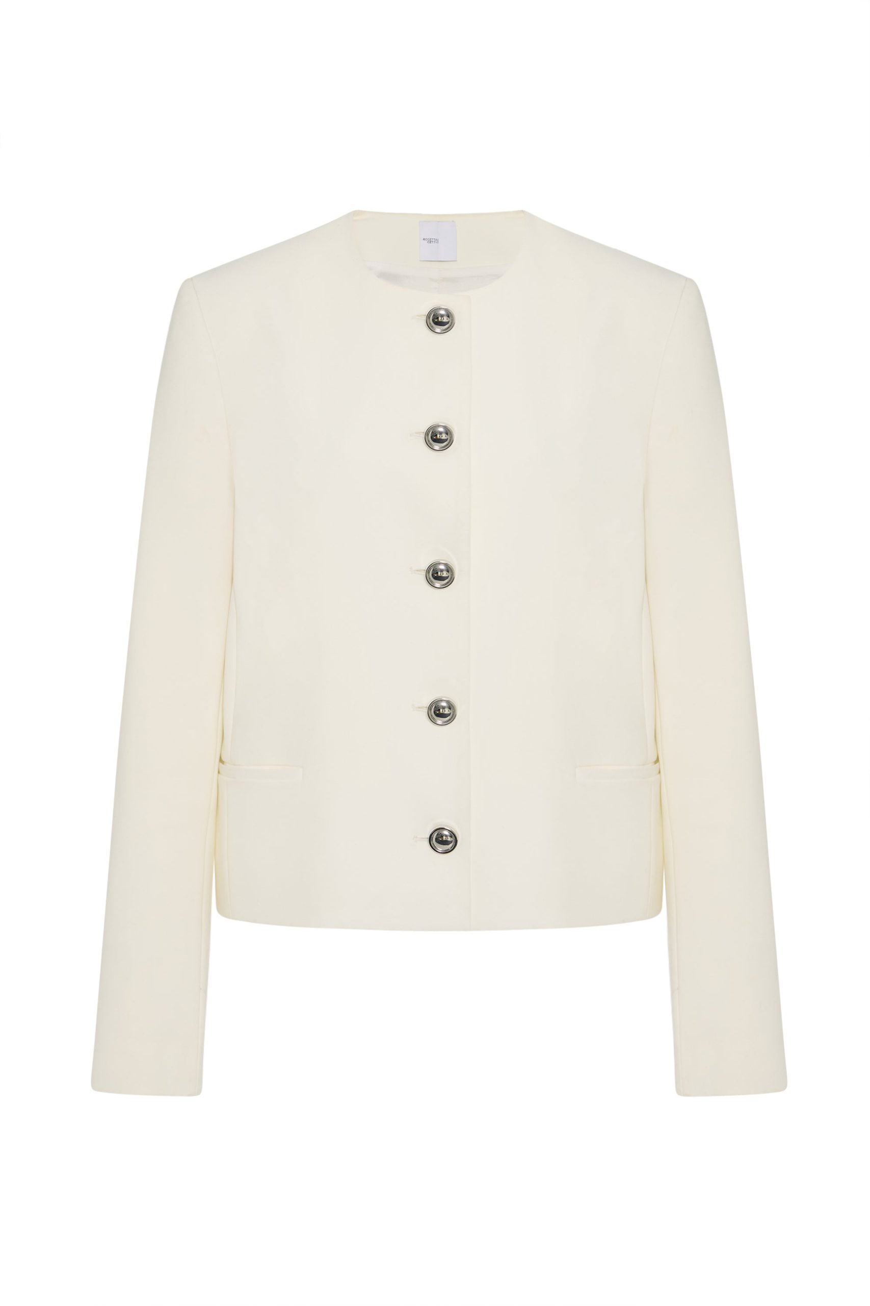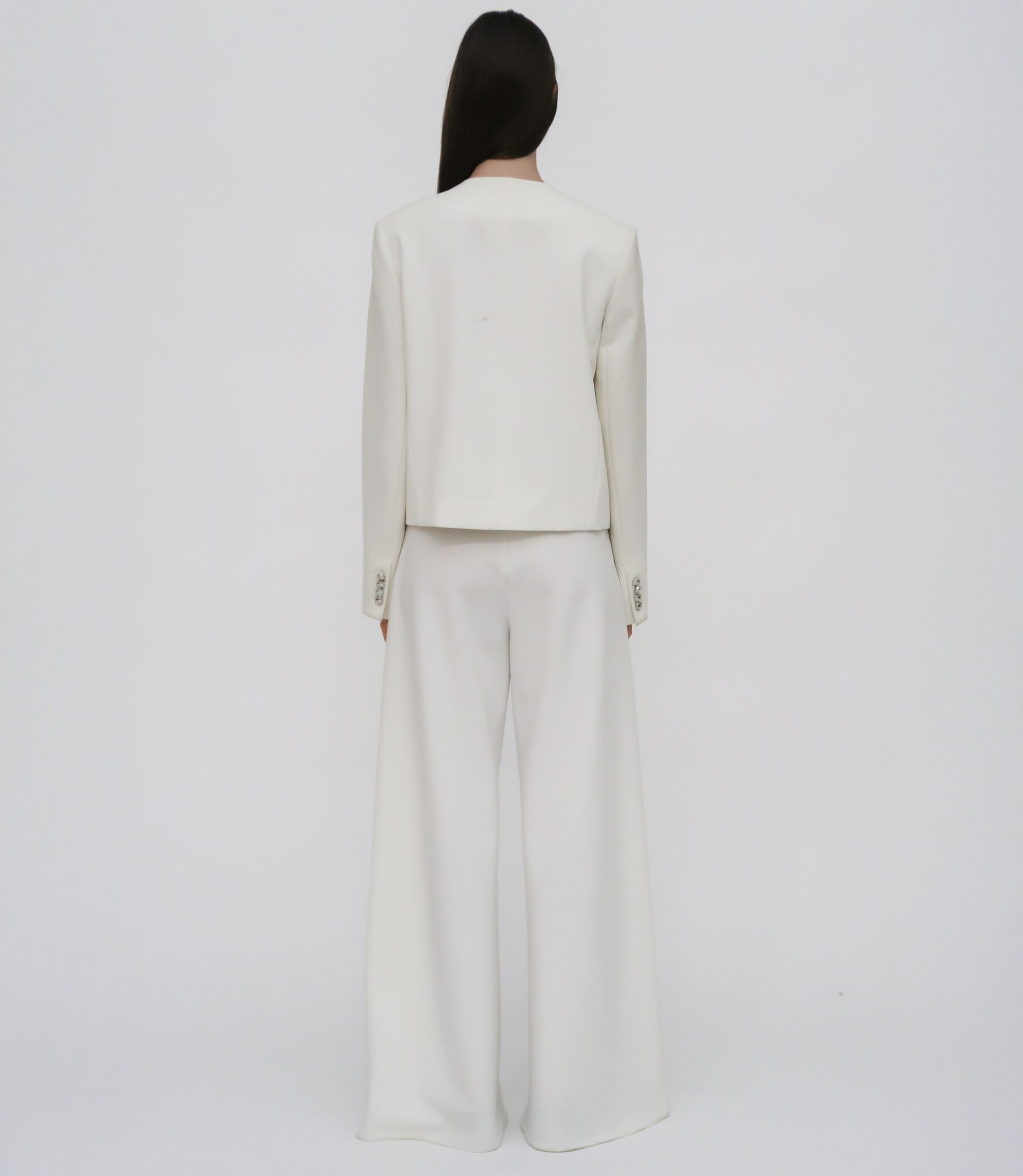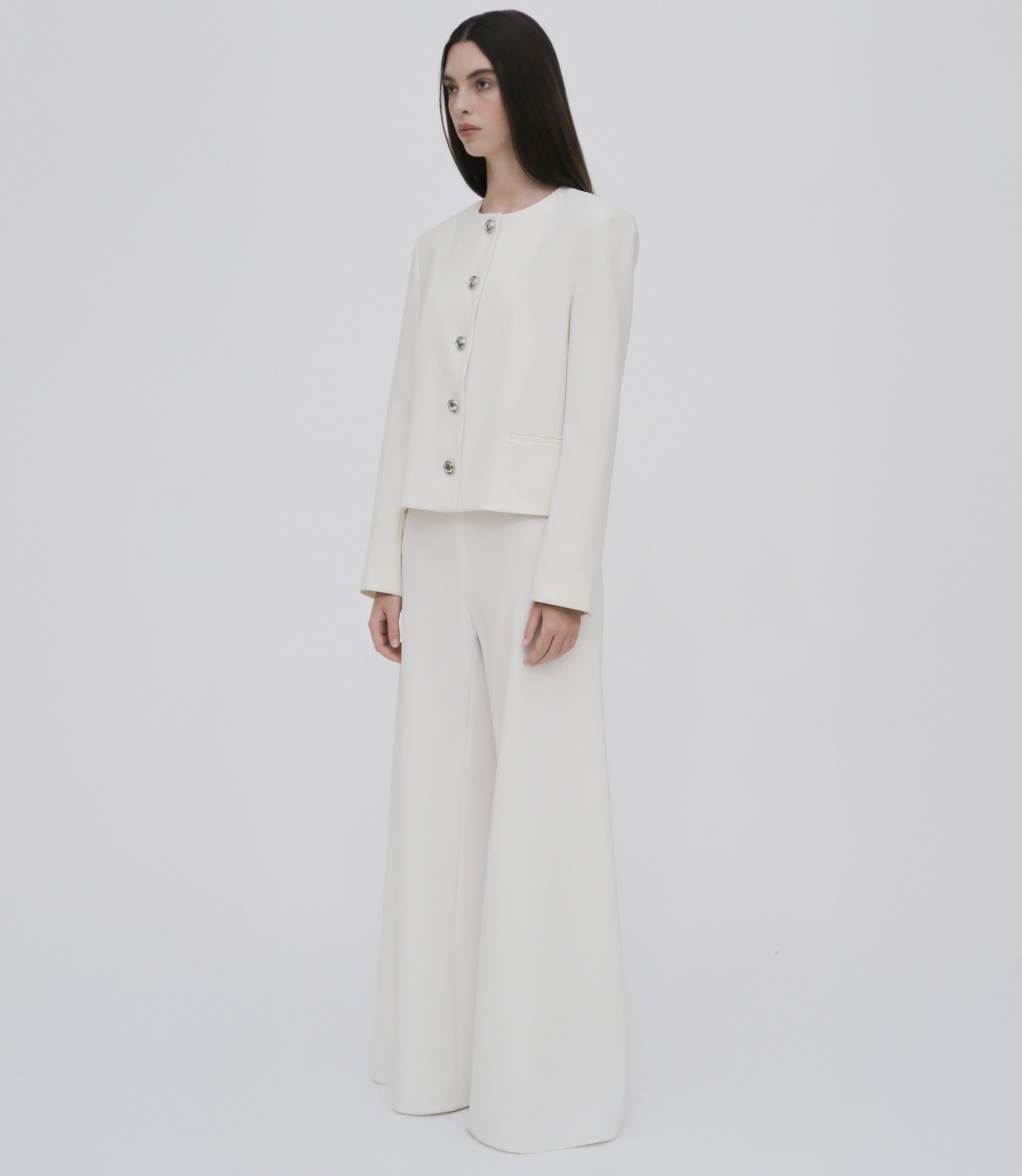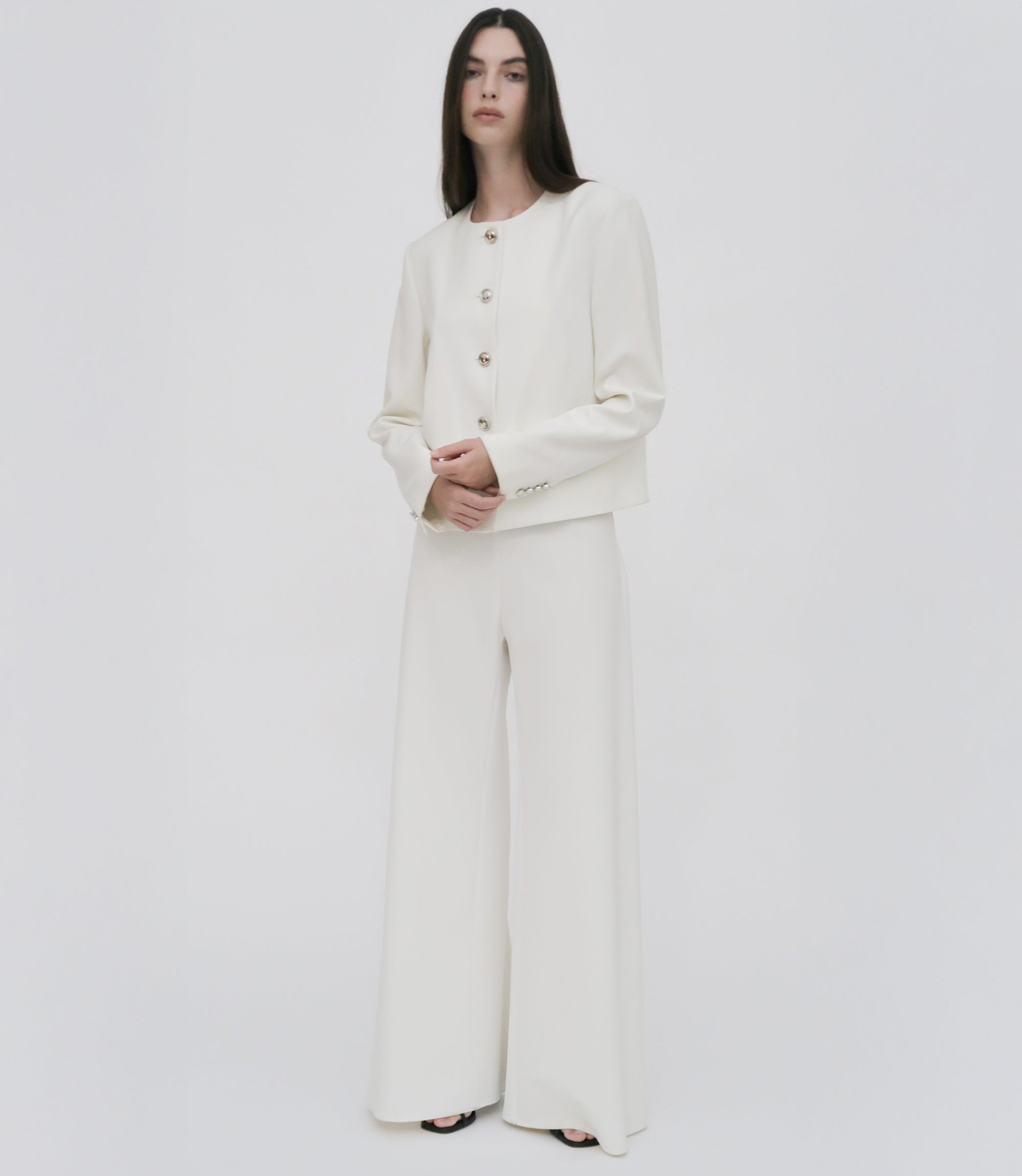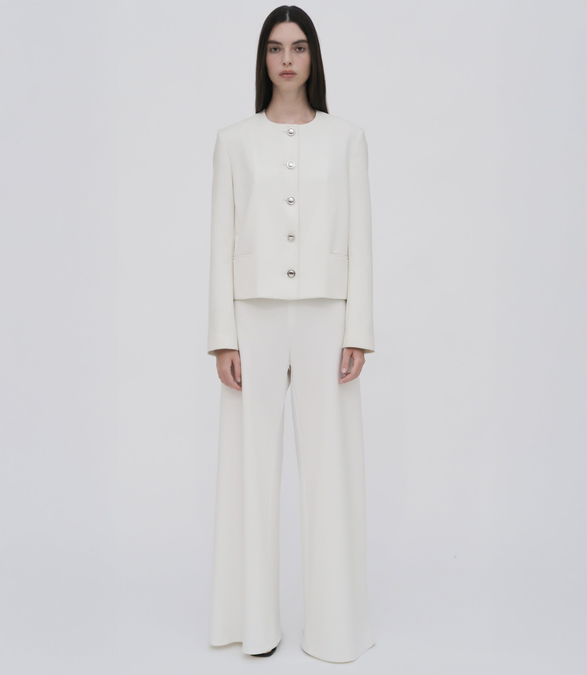 A key silhouette in the Rosetta Getty collection, the Tailored Crewneck Jacket features again for Pre- Fall 25. The sharp style showcases polished minimalism with structured shoulders and a collarless neckline, enhanced with new metal buttons down the front.