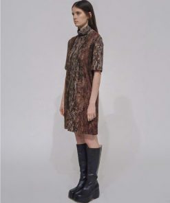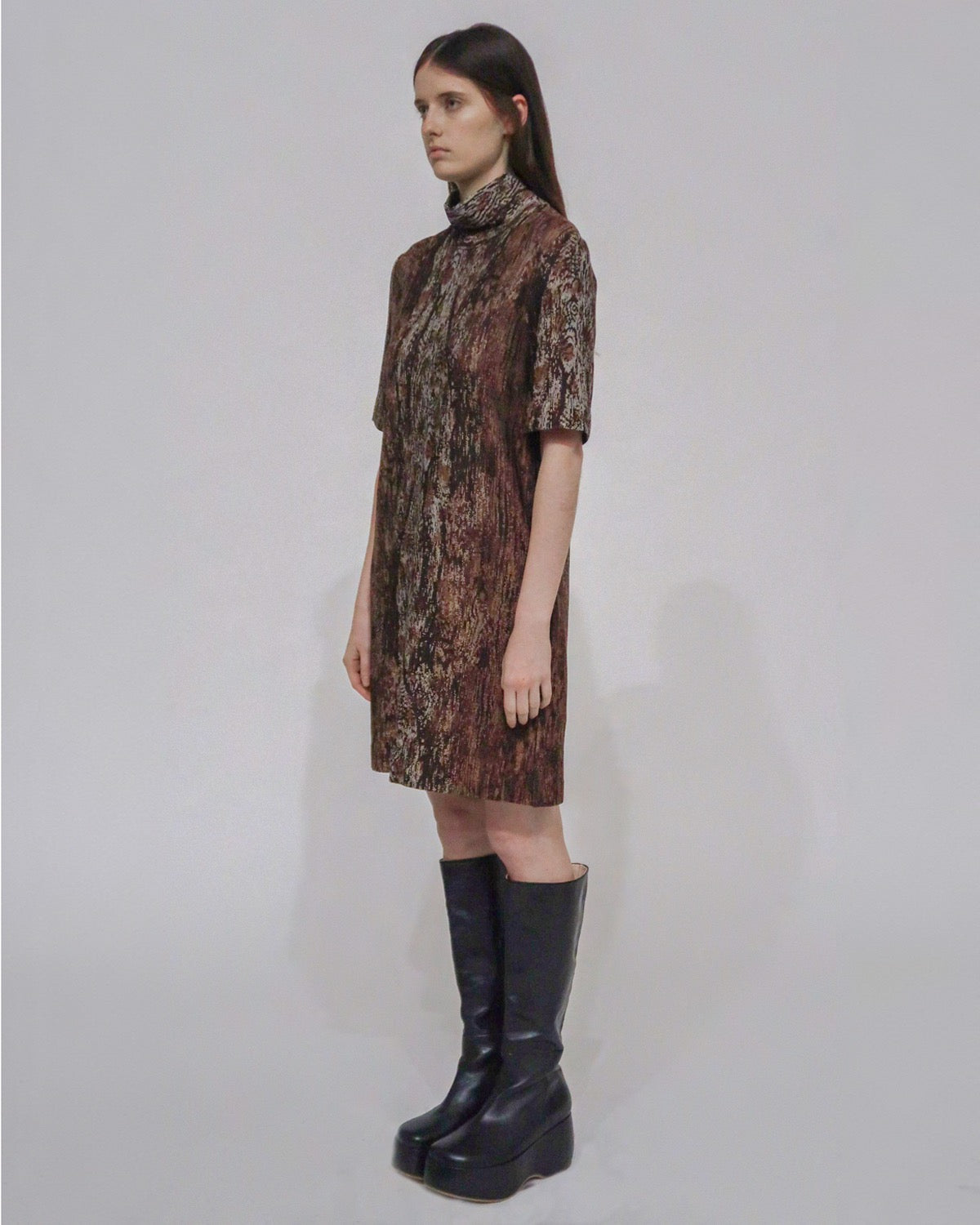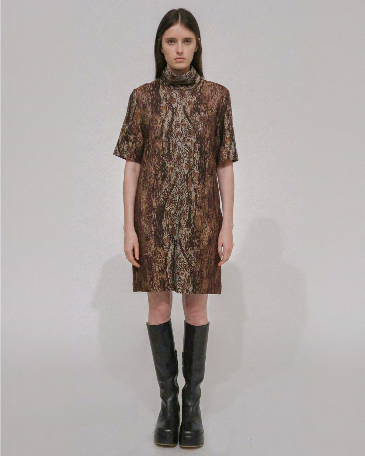 Cut to a classic shift silhouette, this new addition to the Interlock Jacquard wardrobe offers styling worn on its own or layered. The seasonal Woodgrain pattern lends intricacy to the otherwise relaxed silhouette, topped with a loose turtleneck.