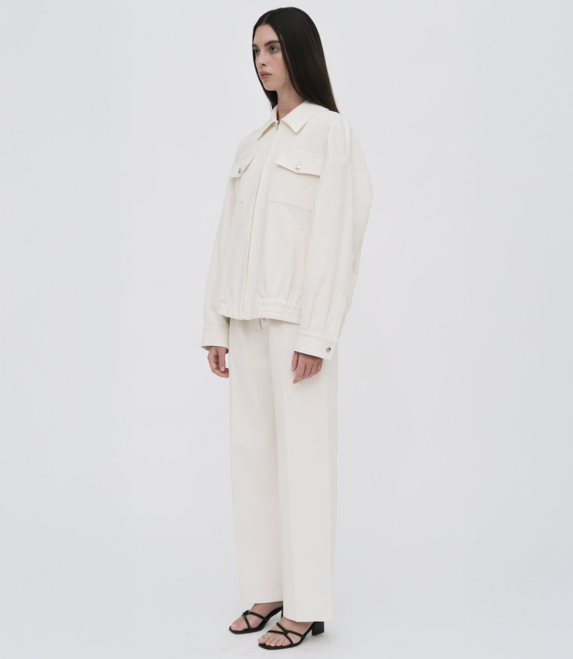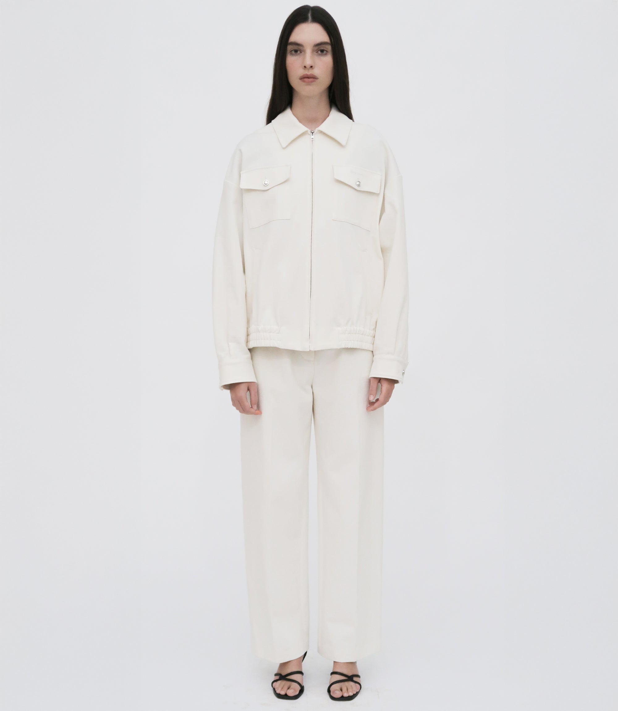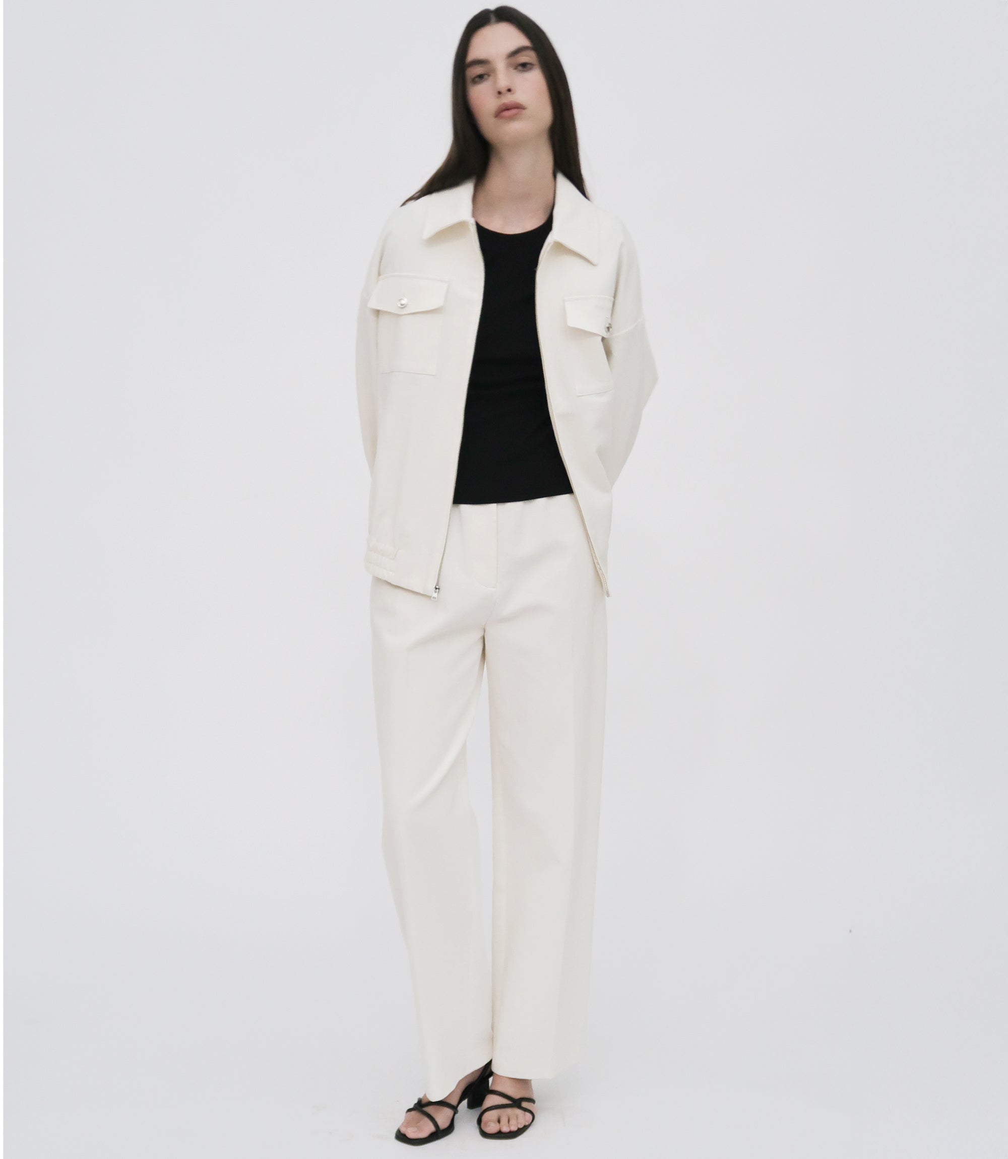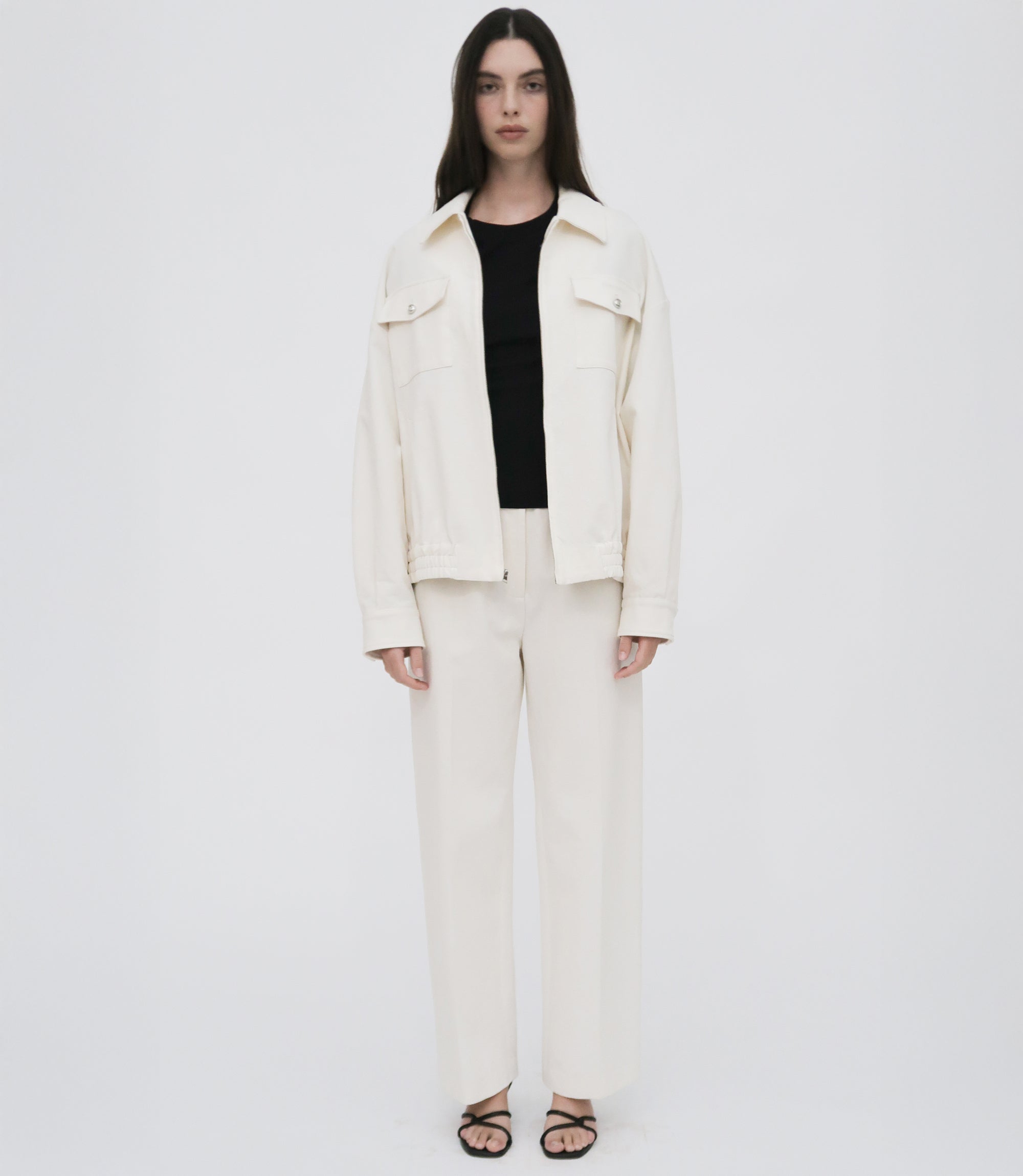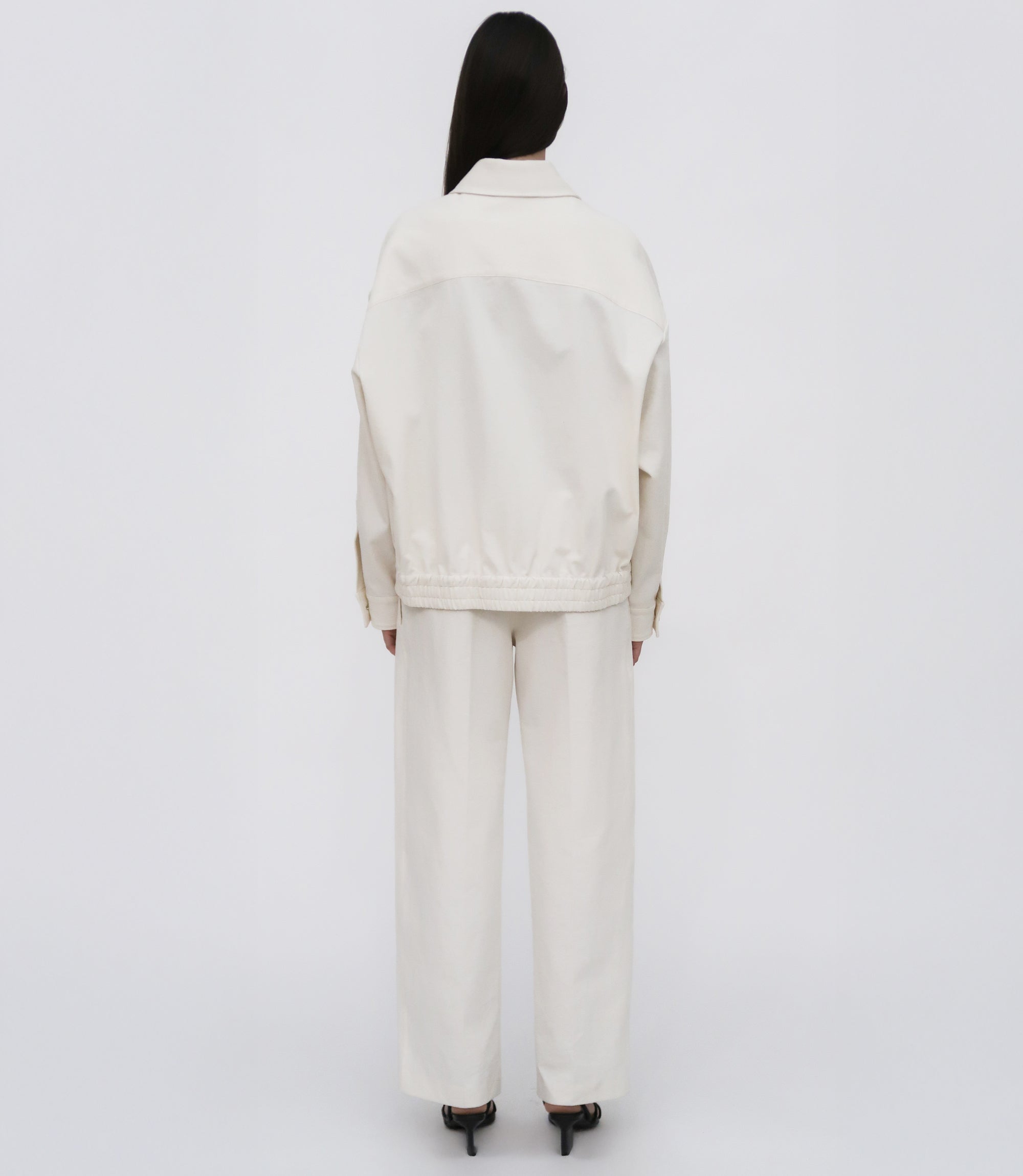 Cut with an oversized silhouette, the new Zip-Front Shirt Jacket has a sporty sensibility. Complementing its Cotton Linen Piqué fabrication, the style blends comfort and versatility with tailored details and an elasticized hem anchoring the blouson bodice. A tonal embroidered logo adorns the pocket, leaving a subtle signature.