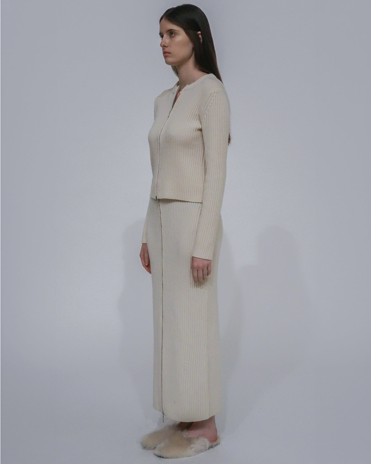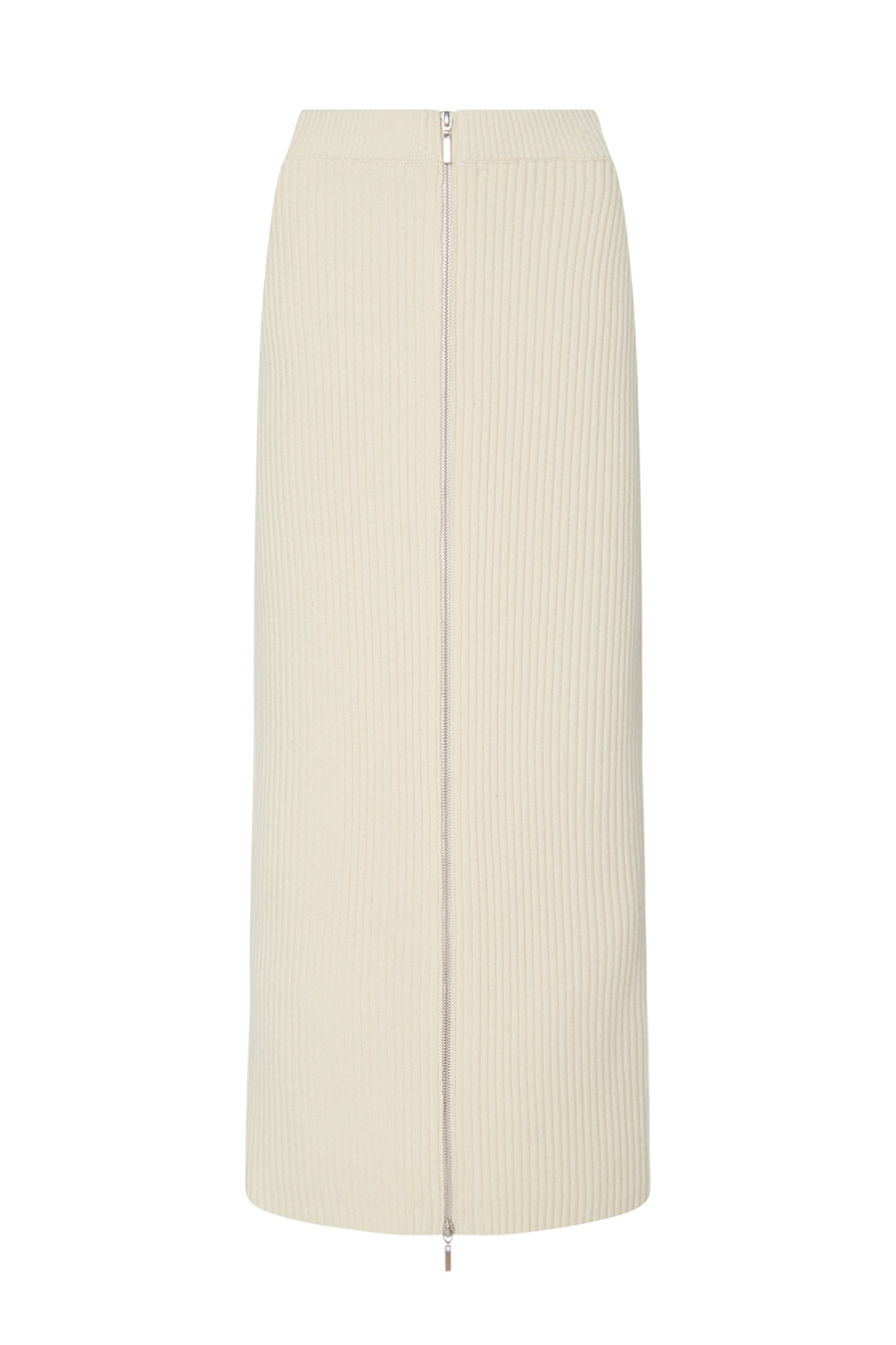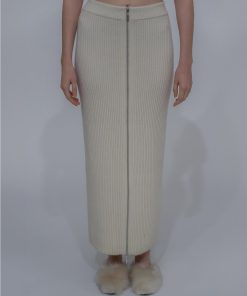 Cut with an elongating column silhouette, Fall 24’s Zip-Up Maxi Skirt is knit of soft Mercerized Wool Cashmere. Substantial but with a plush feel, the flattering and versatile style is finished with a utilitarian two-way front zip closure.